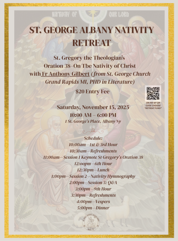 On November 15th from 10:00AM to 6:00PM we will be hosting our annual Nativity Retreat with Fr. Anthony Gilbert. Fr. Anthony holds two graduate degrees in literature: a master’s degree in English language and literature from San Diego State University and a doctoral degree in English and medieval literature and culture from the University of Victoria. During the retreat we will discuss St. Gregory the Theologian’s Oration 38, a Patristic work—given as a sermon at the Feast of Theophany—focused on the theology of Christ’s Incarnation and how His Nativity fits into the story of all creation.